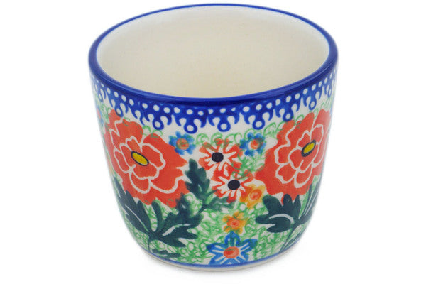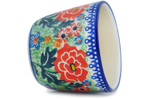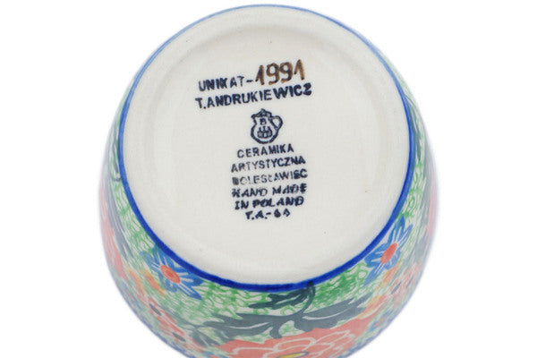This Bold Carnation 6 oz Tumbler was handmade and hand decorated in Boleslawiec, Poland by skilled artisans according to old traditional methods. This is a Polish pottery Signature Unikat, which means that it has been hand painted with both sponges and brushes and it is signed by the artist who painted it. Unikat pieces are the most intricate works of art. Larger Unikat items take hours of very careful work to finish. This Polish stoneware is microwave, dishwasher, freezer, and oven safe up to 480°F. It does not contain lead or cadmium. It is part of the Bold Carnation Collection.