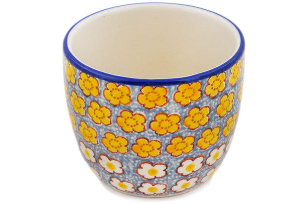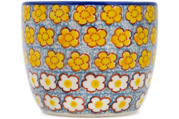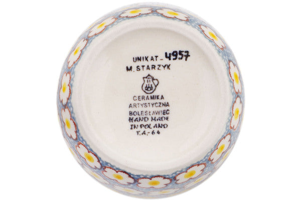 This Popcorn Daisies 6 oz Tumbler was handmade and hand decorated in Boleslawiec, Poland by skilled artisans according to old traditional methods. This is a Polish pottery Signature Unikat, which means that it has been hand painted with both sponges and brushes and it is signed by the artist who painted it. Unikat pieces are the most intricate works of art. Larger Unikat items take hours of very careful work to finish. This Polish stoneware is microwave, dishwasher, freezer, and oven safe up to 480°F. It does not contain lead or cadmium. It is part of the Popcorn Daisies Collection.