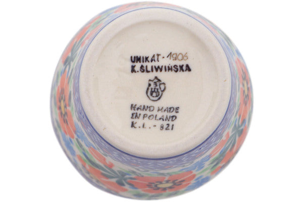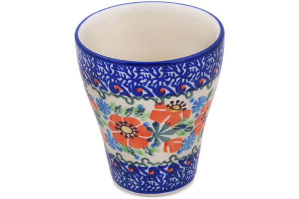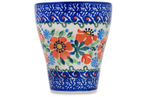This Orange Blooms 7 oz Tumbler was handmade and hand decorated in Boleslawiec, Poland by skilled artisans according to old traditional methods. This is a Polish pottery Signature Unikat, which means that it has been hand painted with both sponges and brushes and it is signed by the artist who painted it. Unikat pieces are the most intricate works of art. Larger Unikat items take hours of very careful work to finish. This Polish stoneware is microwave, dishwasher, freezer, and oven safe up to 480°F. It does not contain lead or cadmium. It is part of the Orange Blooms Collection.