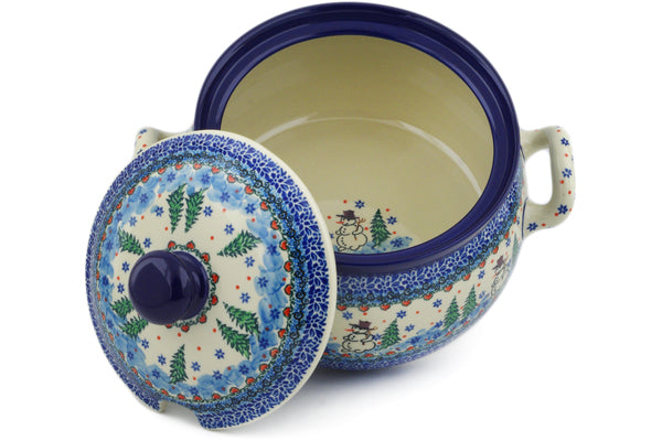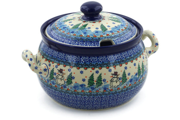 This Dancing Snowman 122 oz Tureen was handmade and hand decorated in Boleslawiec, Poland by skilled artisans according to old traditional methods. This is a Polish pottery Signature Unikat, which means that it has been hand painted with both sponges and brushes and it is signed by the artist who painted it. Unikat pieces are the most intricate works of art. Larger Unikat items take hours of very careful work to finish. This Polish stoneware is microwave, dishwasher, freezer, and oven safe up to 480°F. It does not contain lead or cadmium. It is part of the Dancing Snowman Collection.