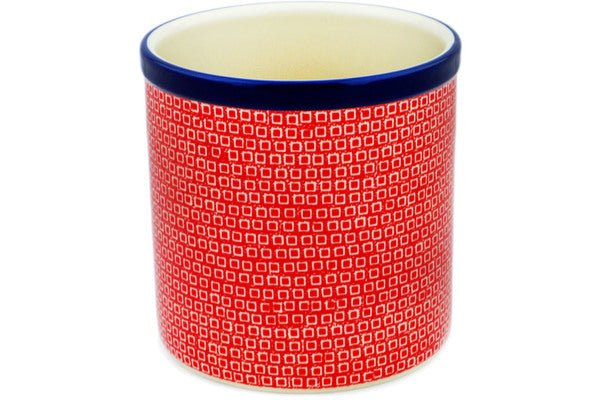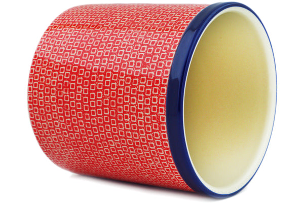 This Red Squares 6" Utensil Jar was handmade and hand decorated in Boleslawiec, Poland by skilled artisans according to old traditional methods. This is a Polish pottery Signature Unikat, which means that it has been hand painted with both sponges and brushes and it is signed by the artist who painted it. Unikat pieces are the most intricate works of art. Larger Unikat items take hours of very careful work to finish. This Polish stoneware is microwave, dishwasher, freezer, and oven safe up to 480°F. It does not contain lead or cadmium. It is part of the Red Squares Collection.