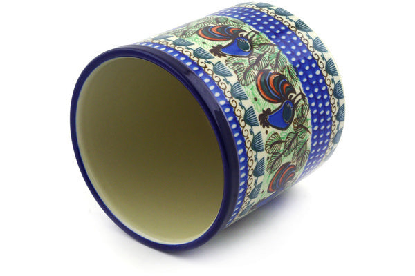 This Rooster Row 6" Utensil Jar was handmade and hand decorated in Boleslawiec, Poland by skilled artisans according to old traditional methods. This is a Polish pottery Signature Unikat, which means that it has been hand painted with both sponges and brushes and it is signed by the artist who painted it. Unikat pieces are the most intricate works of art. Larger Unikat items take hours of very careful work to finish. This Polish stoneware is microwave, dishwasher, freezer, and oven safe up to 480°F. It does not contain lead or cadmium. It is part of the Rooster Row Collection.