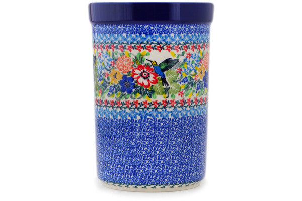 This Hummingbird Meadow 8" Utensil Jar was handmade and hand decorated in Boleslawiec, Poland by skilled artisans according to old traditional methods. This is a Polish pottery Signature Unikat, which means that it has been hand painted with both sponges and brushes and it is signed by the artist who painted it. Unikat pieces are the most intricate works of art. Larger Unikat items take hours of very careful work to finish. This Polish stoneware is microwave, dishwasher, freezer, and oven safe up to 480°F. It does not contain lead or cadmium. It is part of the Hummingbird Meadow Collection.