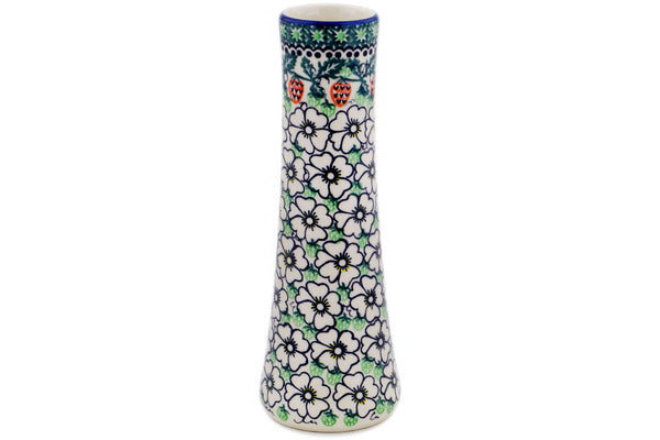 This Strawberries And Cream 10" Vase was handmade and hand decorated in Boleslawiec, Poland by skilled artisans according to old traditional methods. This is a Polish pottery Signature Unikat, which means that it has been hand painted with both sponges and brushes and it is signed by the artist who painted it. Unikat pieces are the most intricate works of art. Larger Unikat items take hours of very careful work to finish. This Polish stoneware is microwave, dishwasher, freezer, and oven safe up to 480°F. It does not contain lead or cadmium. It is part of the Strawberries And Cream Collection.