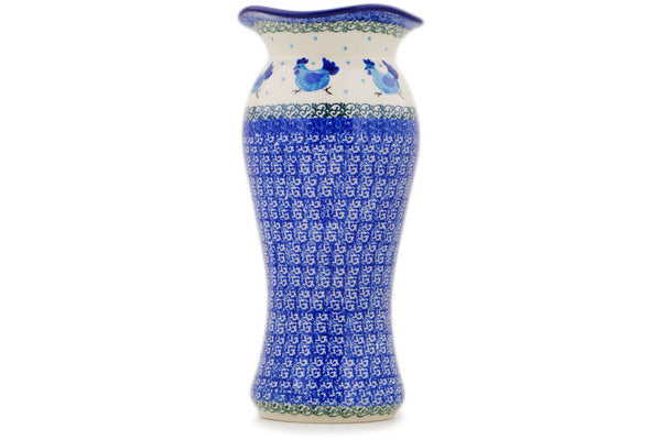 This Chicken Merry-Go-Round 11" Vase was handmade and hand decorated in Boleslawiec, Poland by skilled artisans according to old traditional methods. This Polish stoneware is microwave, dishwasher, freezer, and oven safe up to 480°F. It does not contain lead or cadmium. It is part of the Chicken Merry-Go-Round Collection.