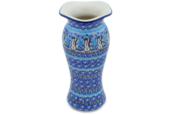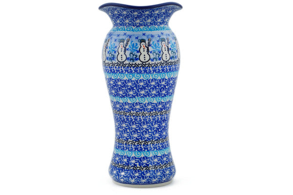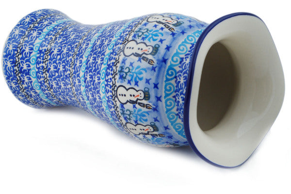 This Snowmen Circle 11" Vase was handmade and hand decorated in Boleslawiec, Poland by skilled artisans according to old traditional methods. This is a Polish pottery Signature Unikat, which means that it has been hand painted with both sponges and brushes and it is signed by the artist who painted it. Unikat pieces are the most intricate works of art. Larger Unikat items take hours of very careful work to finish. This Polish stoneware is microwave, dishwasher, freezer, and oven safe up to 480°F. It does not contain lead or cadmium. It is part of the Snowmen Circle Collection.