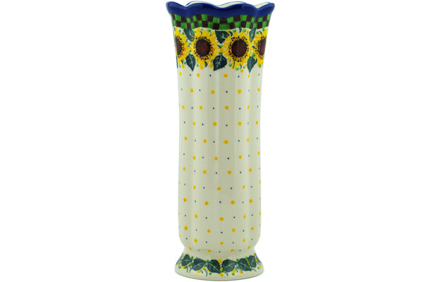 This Summer Sunflower 11" Vase was handmade and hand decorated in Boleslawiec, Poland by skilled artisans according to old traditional methods. This is a Polish pottery Signature Unikat, which means that it has been hand painted with both sponges and brushes and it is signed by the artist who painted it. Unikat pieces are the most intricate works of art. Larger Unikat items take hours of very careful work to finish. This Polish stoneware is microwave, dishwasher, freezer, and oven safe up to 480°F. It does not contain lead or cadmium. It is part of the Summer Sunflower Collection.