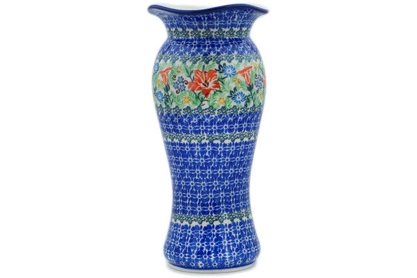 This Trumpet Garden 11" Vase was handmade and hand decorated in Boleslawiec, Poland by skilled artisans according to old traditional methods. This is a Polish pottery Signature Unikat, which means that it has been hand painted with both sponges and brushes and it is signed by the artist who painted it. Unikat pieces are the most intricate works of art. Larger Unikat items take hours of very careful work to finish. This Polish stoneware is microwave, dishwasher, freezer, and oven safe up to 480°F. It does not contain lead or cadmium. It is part of the Trumpet Garden Collection.