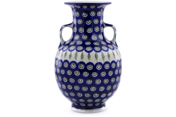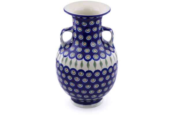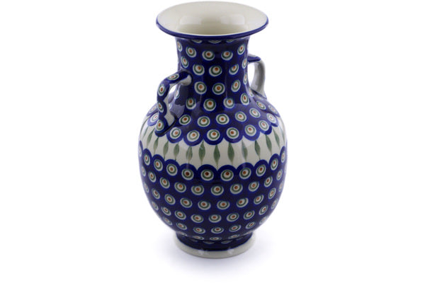 This Peacock Leaves 12" Vase was handmade and hand decorated in Boleslawiec, Poland by skilled artisans according to old traditional methods. This Polish stoneware is microwave, dishwasher, freezer, and oven safe up to 480°F. It does not contain lead or cadmium. It is part of the Peacock Leaves Collection.