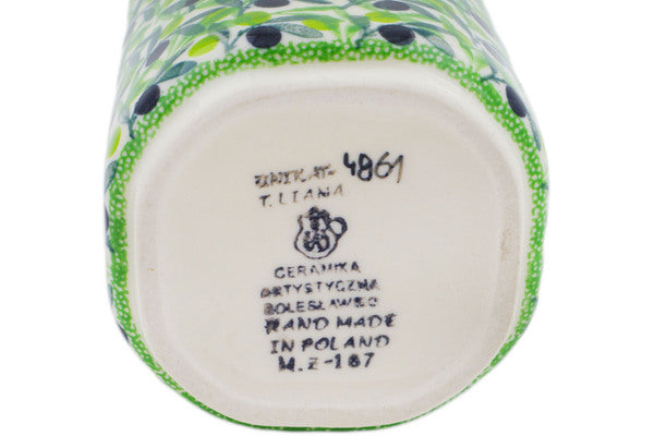This Olive Grove 13" Vase was handmade and hand decorated in Boleslawiec, Poland by skilled artisans according to old traditional methods. This is a Polish pottery Signature Unikat, which means that it has been hand painted with both sponges and brushes and it is signed by the artist who painted it. Unikat pieces are the most intricate works of art. Larger Unikat items take hours of very careful work to finish. This Polish stoneware is microwave, dishwasher, freezer, and oven safe up to 480°F. It does not contain lead or cadmium. It is part of the Olive Grove Collection.