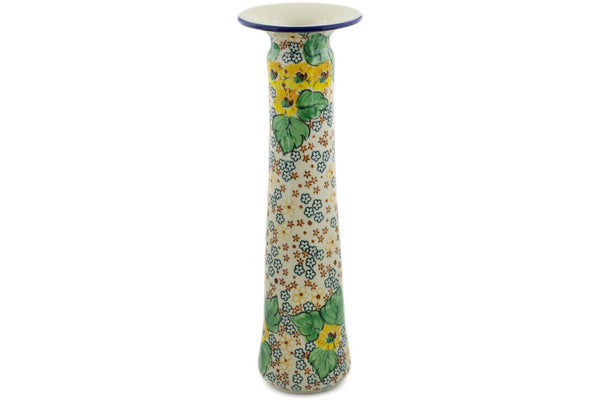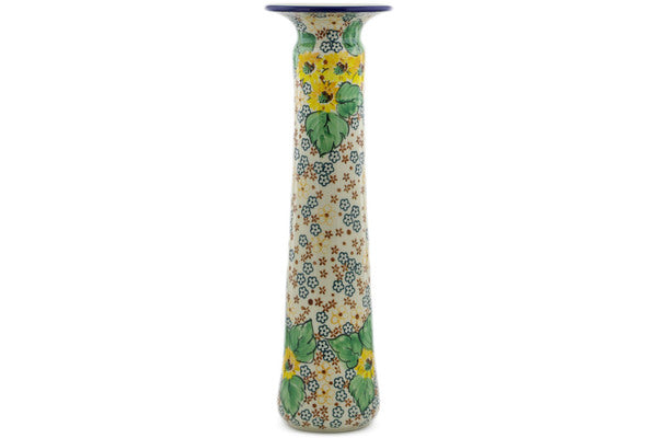 This Country Sunflower 15" Vase was handmade and hand decorated in Boleslawiec, Poland by skilled artisans according to old traditional methods. This is a Polish pottery Signature Unikat, which means that it has been hand painted with both sponges and brushes and it is signed by the artist who painted it. Unikat pieces are the most intricate works of art. Larger Unikat items take hours of very careful work to finish. This Polish stoneware is microwave, dishwasher, freezer, and oven safe up to 480°F. It does not contain lead or cadmium. It is part of the Country Sunflower Collection.