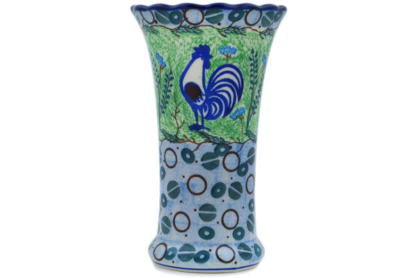 This Blue Rooster 7" Vase was handmade and hand decorated in Boleslawiec, Poland by skilled artisans according to old traditional methods. This is a Polish pottery Signature Unikat, which means that it has been hand painted with both sponges and brushes and it is signed by the artist who painted it. Unikat pieces are the most intricate works of art. Larger Unikat items take hours of very careful work to finish. This Polish stoneware is microwave, dishwasher, freezer, and oven safe up to 480°F. It does not contain lead or cadmium. It is part of the Blue Rooster Collection.