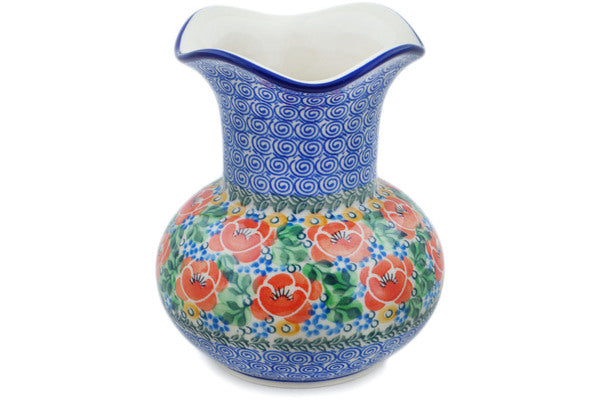 This Red Poppy Burst 7" Vase was handmade and hand decorated in Boleslawiec, Poland by skilled artisans according to old traditional methods. This is a Polish pottery Signature Unikat, which means that it has been hand painted with both sponges and brushes and it is signed by the artist who painted it. Unikat pieces are the most intricate works of art. Larger Unikat items take hours of very careful work to finish. This Polish stoneware is microwave, dishwasher, freezer, and oven safe up to 480°F. It does not contain lead or cadmium. It is part of the Red Poppy Burst Collection.