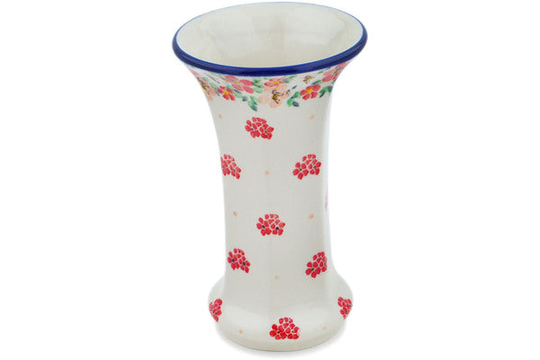 This Rosey Starburst Poppy 7" Vase was handmade and hand decorated in Boleslawiec, Poland by skilled artisans according to old traditional methods. This is a Polish pottery Signature Unikat, which means that it has been hand painted with both sponges and brushes and it is signed by the artist who painted it. Unikat pieces are the most intricate works of art. Larger Unikat items take hours of very careful work to finish. This Polish stoneware is microwave, dishwasher, freezer, and oven safe up to 480°F. It does not contain lead or cadmium. It is part of the Rosey Starburst Poppy Collection.