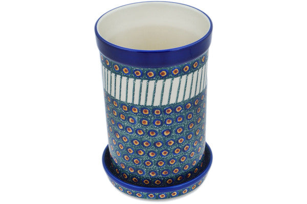 This Emerald Peacock 8" Wine Chill with Saucer was handmade and hand decorated in Boleslawiec, Poland by skilled artisans according to old traditional methods. This Polish stoneware is microwave, dishwasher, freezer, and oven safe up to 480°F. It does not contain lead or cadmium. It is part of the Emerald Peacock Collection.