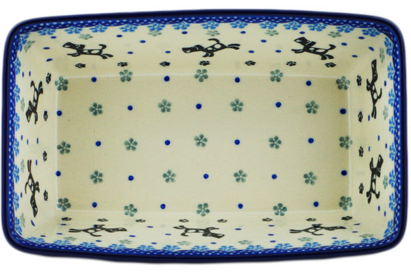 This Playing Pups 8" Loaf Pan 8" was handmade and hand decorated in Boleslawiec, Poland by skilled artisans according to old traditional methods. This Polish stoneware is microwave, dishwasher, freezer, and oven safe up to 480°F. It does not contain lead or cadmium. It is part of the Playing Pups Collection.