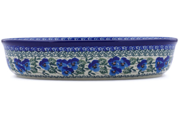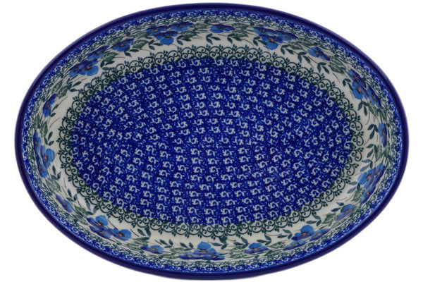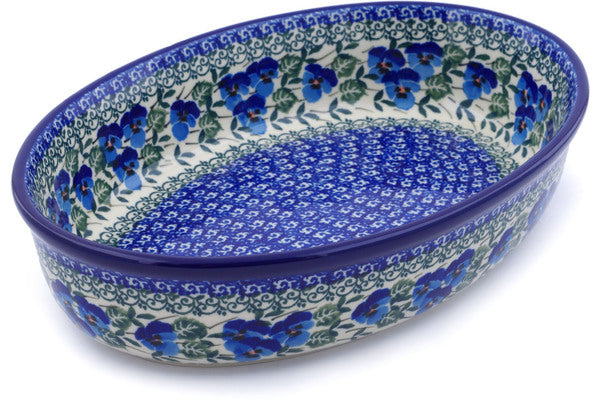 This Blue Pansy 11" Oval Baker was handmade and hand decorated in Boleslawiec, Poland by skilled artisans according to old traditional methods. This Polish stoneware is microwave, dishwasher, freezer, and oven safe up to 480°F. It does not contain lead or cadmium. It is part of the Blue Pansy Collection.