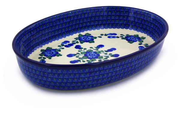 This Blue Poppies 14" Oval Baker was handmade and hand decorated in Boleslawiec, Poland by skilled artisans according to old traditional methods. This Polish stoneware is microwave, dishwasher, freezer, and oven safe up to 480°F. It does not contain lead or cadmium. It is part of the Blue Poppies Collection.