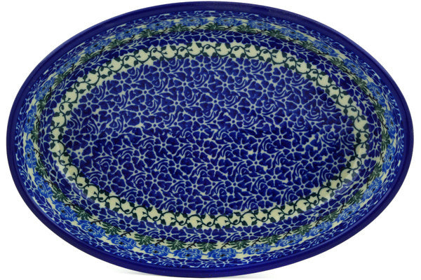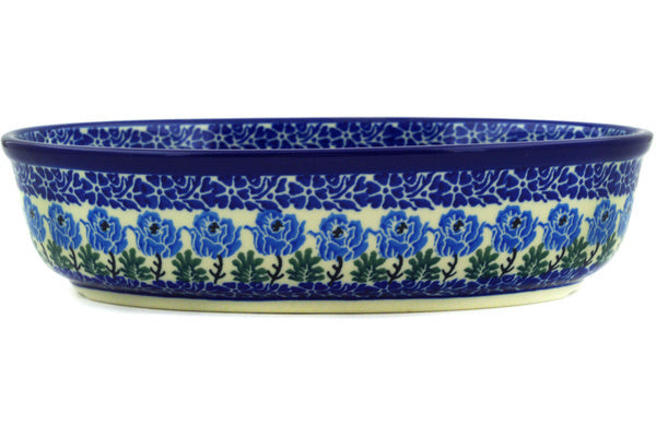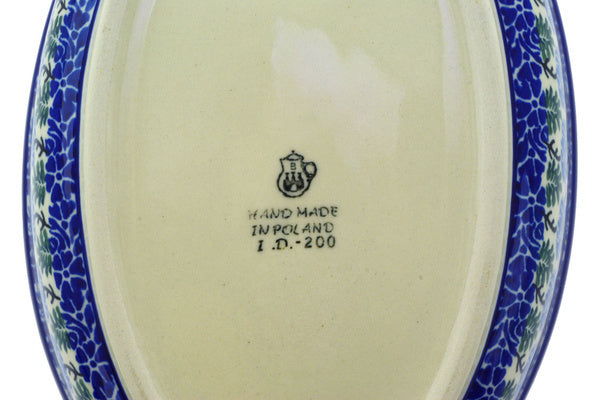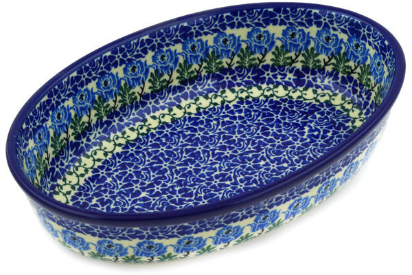 This Blue Rosette Wreath 9" Oval Baker was handmade and hand decorated in Boleslawiec, Poland by skilled artisans according to old traditional methods. This Polish stoneware is microwave, dishwasher, freezer, and oven safe up to 480°F. It does not contain lead or cadmium. It is part of the Blue Rosette Wreath Collection.