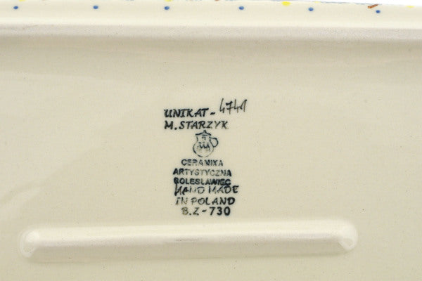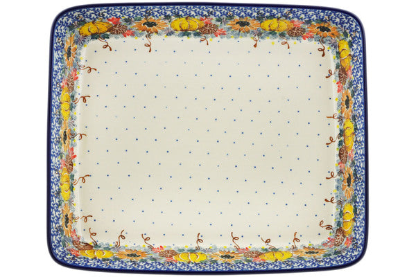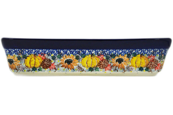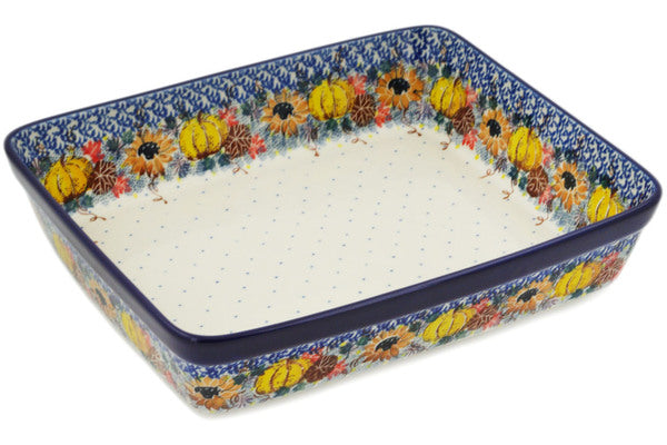This Autumn Falling Leaves 12" Rectangular Baker was handmade and hand decorated in Boleslawiec, Poland by skilled artisans according to old traditional methods. This is a Polish pottery Signature Unikat, which means that it has been hand painted with both sponges and brushes and it is signed by the artist who painted it. Unikat pieces are the most intricate works of art. Larger Unikat items take hours of very careful work to finish. This Polish stoneware is microwave, dishwasher, freezer, and oven safe up to 480°F. It does not contain lead or cadmium. It is part of the Autumn Falling Leaves Collection.