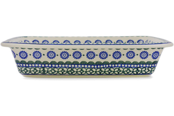 This Maia 14" Rectangular Baker was handmade and hand decorated in Boleslawiec, Poland by skilled artisans according to old traditional methods. This Polish stoneware is microwave, dishwasher, freezer, and oven safe up to 480°F. It does not contain lead or cadmium. It is part of the Maia Collection.