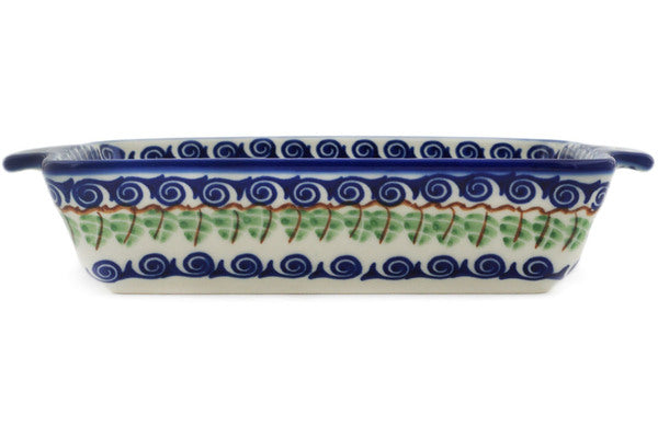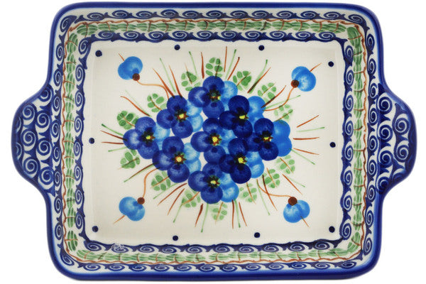 This Blue Pansy 9" Rectangular Baker with Handles was handmade and hand decorated in Boleslawiec, Poland by skilled artisans according to old traditional methods. This Polish stoneware is microwave, dishwasher, freezer, and oven safe up to 480°F. It does not contain lead or cadmium. It is part of the Blue Pansy Collection.