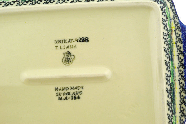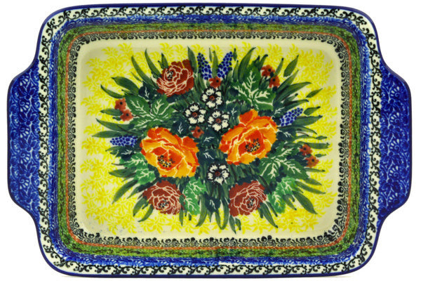 This Copper Rose Meadow 9" Rectangular Baker with Handles was handmade and hand decorated in Boleslawiec, Poland by skilled artisans according to old traditional methods. This is a Polish pottery Signature Unikat, which means that it has been hand painted with both sponges and brushes and it is signed by the artist who painted it. Unikat pieces are the most intricate works of art. Larger Unikat items take hours of very careful work to finish. This Polish stoneware is microwave, dishwasher, freezer, and oven safe up to 480°F. It does not contain lead or cadmium. It is part of the Copper Rose Meadow Collection.