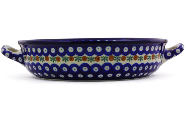 This Mosquito Medium Round Baker with Handles 10-inch was handmade and hand decorated in Boleslawiec, Poland by skilled artisans according to old traditional methods. This Polish stoneware is microwave, dishwasher, freezer, and oven safe up to 480°F. It does not contain lead or cadmium. It is part of the Mosquito Collection.