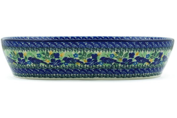 This Sitting Blue Birds 14" Bowl was handmade and hand decorated in Boleslawiec, Poland by skilled artisans according to old traditional methods. This is a Polish pottery Signature Unikat, which means that it has been hand painted with both sponges and brushes and it is signed by the artist who painted it. Unikat pieces are the most intricate works of art. Larger Unikat items take hours of very careful work to finish. This Polish stoneware is microwave, dishwasher, freezer, and oven safe up to 480°F. It does not contain lead or cadmium. It is part of the Sitting Blue Birds Collection.