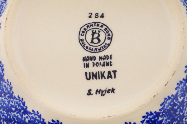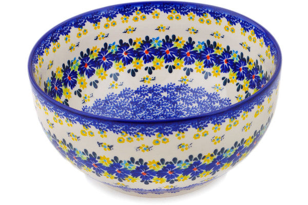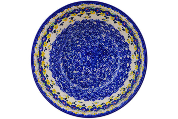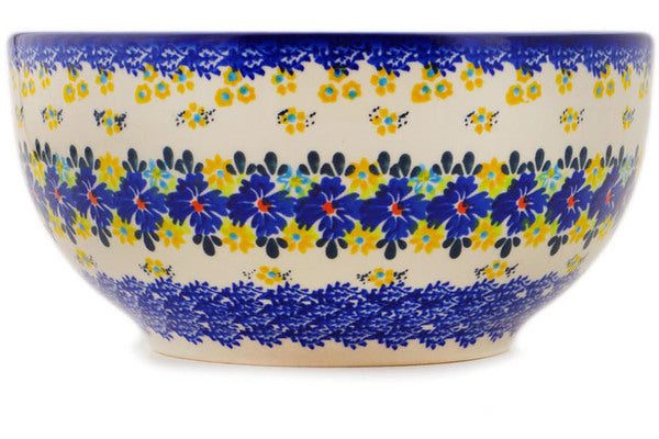 This Cornflower Meadow 9" Mixing bowl, serving bowl was handmade and hand decorated in Boleslawiec, Poland by skilled artisans according to old traditional methods. This Polish stoneware is microwave, dishwasher, freezer, and oven safe up to 480°F. It does not contain lead or cadmium. It is part of the Cornflower Meadow Collection.