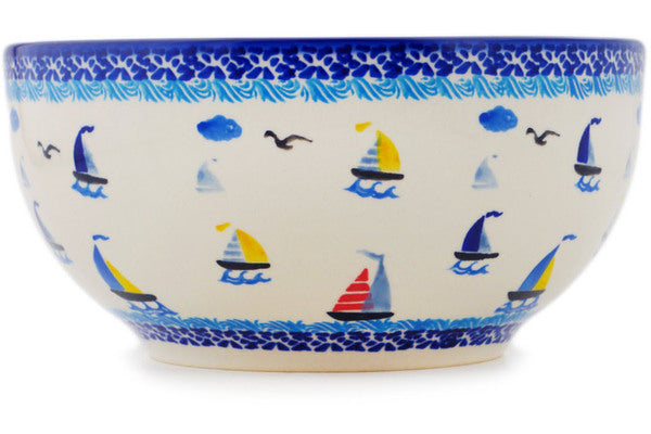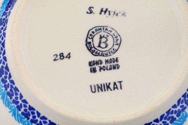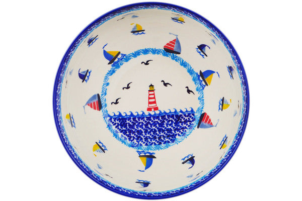 This Sea Sights 9" Mixing bowl, serving bowl was handmade and hand decorated in Boleslawiec, Poland by skilled artisans according to old traditional methods. This is a Polish pottery Signature Unikat, which means that it has been hand painted with both sponges and brushes and it is signed by the artist who painted it. Unikat pieces are the most intricate works of art. Larger Unikat items take hours of very careful work to finish. This Polish stoneware is microwave, dishwasher, freezer, and oven safe up to 480°F. It does not contain lead or cadmium. It is part of the Sea Sights Collection.