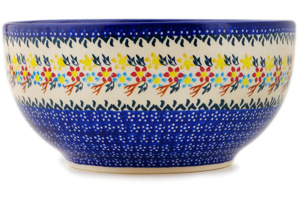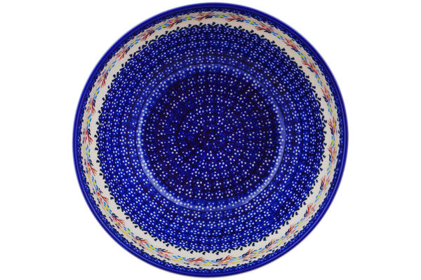 This Spring Flower Ring 9" Mixing bowl, serving bowl was handmade and hand decorated in Boleslawiec, Poland by skilled artisans according to old traditional methods. This Polish stoneware is microwave, dishwasher, freezer, and oven safe up to 480°F. It does not contain lead or cadmium. It is part of the Spring Flower Ring Collection.
