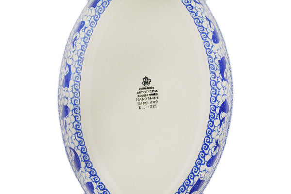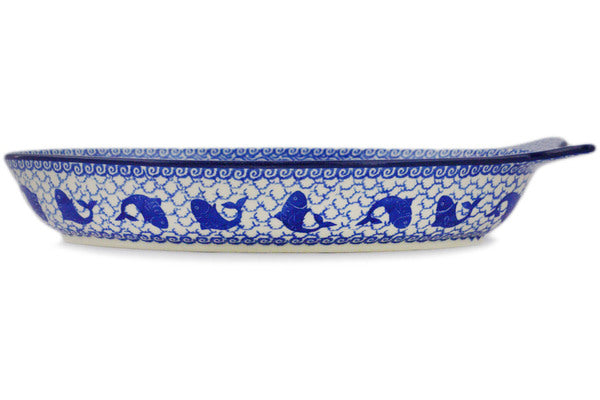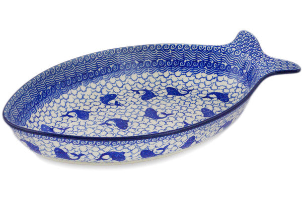 This Dancing Fish 13" Fish Shaped Platter was handmade and hand decorated in Boleslawiec, Poland by skilled artisans according to old traditional methods. This Polish stoneware is microwave, dishwasher, freezer, and oven safe up to 480°F. It does not contain lead or cadmium. It is part of the Dancing Fish Collection.