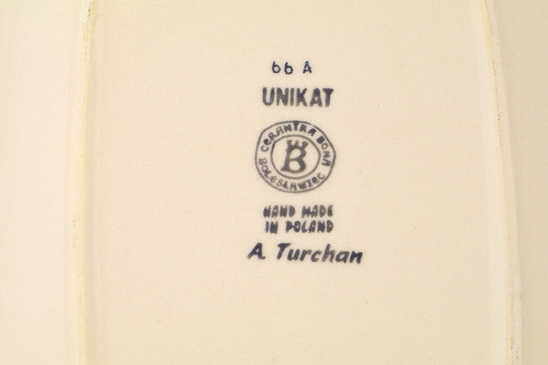 This Fall Garden 14" Platter was handmade and hand decorated in Boleslawiec, Poland by skilled artisans according to old traditional methods. This is a Polish pottery Signature Unikat, which means that it has been hand painted with both sponges and brushes and it is signed by the artist who painted it. Unikat pieces are the most intricate works of art. Larger Unikat items take hours of very careful work to finish. This Polish stoneware is microwave, dishwasher, freezer, and oven safe up to 480°F. It does not contain lead or cadmium. It is part of the Fall Garden Collection.