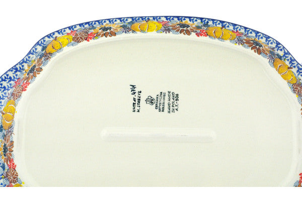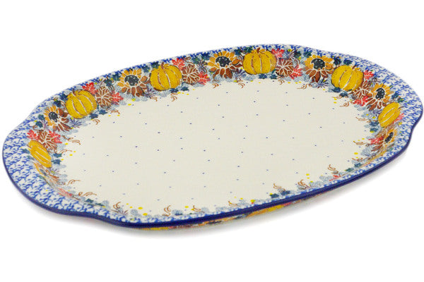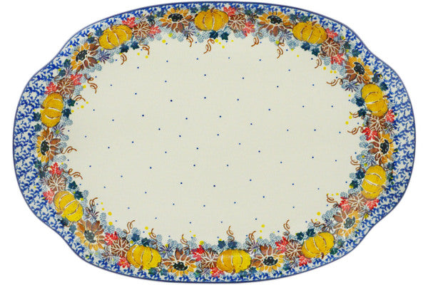 This Autumn Falling Leaves 15" Platter was handmade and hand decorated in Boleslawiec, Poland by skilled artisans according to old traditional methods. This is a Polish pottery Signature Unikat, which means that it has been hand painted with both sponges and brushes and it is signed by the artist who painted it. Unikat pieces are the most intricate works of art. Larger Unikat items take hours of very careful work to finish. This Polish stoneware is microwave, dishwasher, freezer, and oven safe up to 480°F. It does not contain lead or cadmium. It is part of the Autumn Falling Leaves Collection.