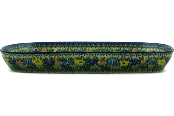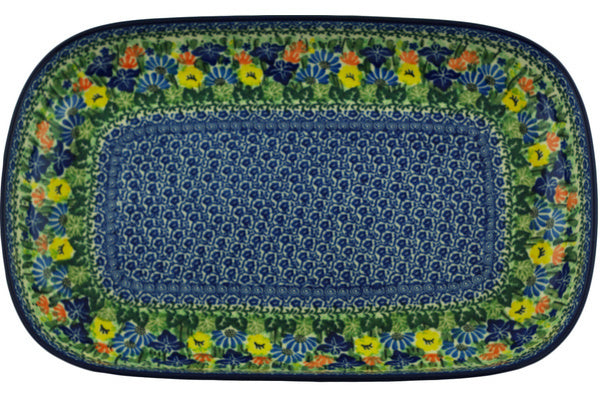 This Wild Flower Lake 16" Platter was handmade and hand decorated in Boleslawiec, Poland by skilled artisans according to old traditional methods. This is a Polish pottery Signature Unikat, which means that it has been hand painted with both sponges and brushes and it is signed by the artist who painted it. Unikat pieces are the most intricate works of art. Larger Unikat items take hours of very careful work to finish. This Polish stoneware is microwave, dishwasher, freezer, and oven safe up to 480°F. It does not contain lead or cadmium. It is part of the Wild Flower Lake Collection.