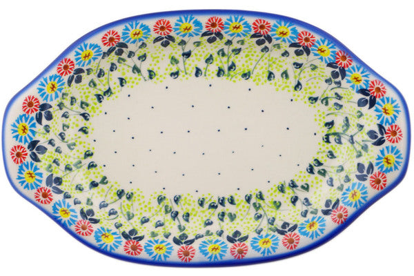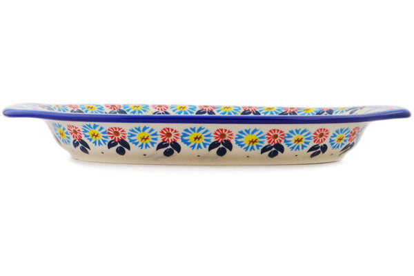 This Long-stemmed Beauties 12" Platter with Handles was handmade and hand decorated in Boleslawiec, Poland by skilled artisans according to old traditional methods. This Polish stoneware is microwave, dishwasher, freezer, and oven safe up to 480°F. It does not contain lead or cadmium. It is part of the Long-stemmed Beauties Collection.