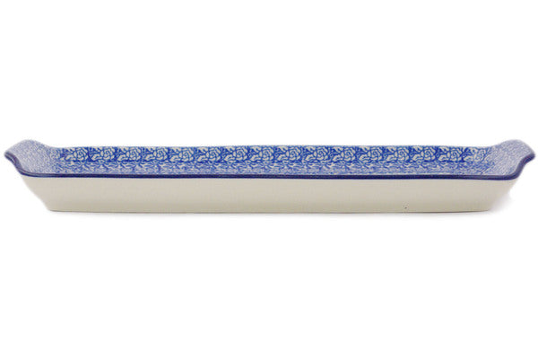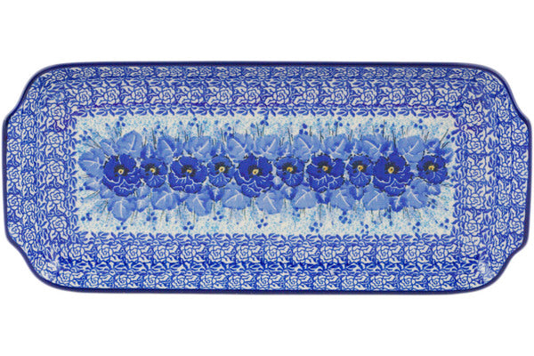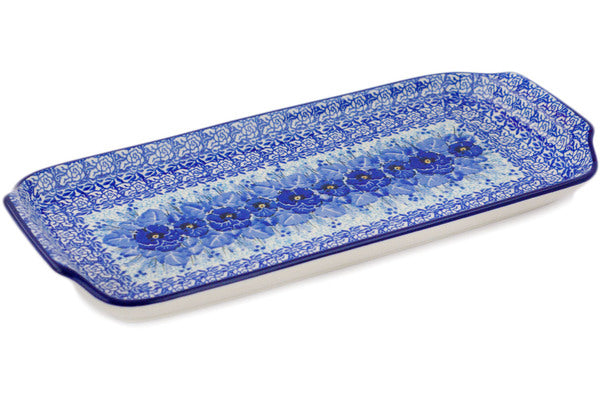 This Deep Winter 13" Platter with Handles was handmade and hand decorated in Boleslawiec, Poland by skilled artisans according to old traditional methods. This is a Polish pottery Signature Unikat, which means that it has been hand painted with both sponges and brushes and it is signed by the artist who painted it. Unikat pieces are the most intricate works of art. Larger Unikat items take hours of very careful work to finish. This Polish stoneware is microwave, dishwasher, freezer, and oven safe up to 480°F. It does not contain lead or cadmium. It is part of the Deep Winter Collection.