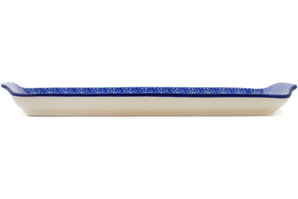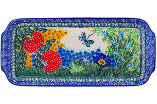 This Dragonfly Delight 13" Platter with Handles was handmade and hand decorated in Boleslawiec, Poland by skilled artisans according to old traditional methods. This is a Polish pottery Signature Unikat, which means that it has been hand painted with both sponges and brushes and it is signed by the artist who painted it. Unikat pieces are the most intricate works of art. Larger Unikat items take hours of very careful work to finish. This Polish stoneware is microwave, dishwasher, freezer, and oven safe up to 480°F. It does not contain lead or cadmium. It is part of the Dragonfly Delight Collection.