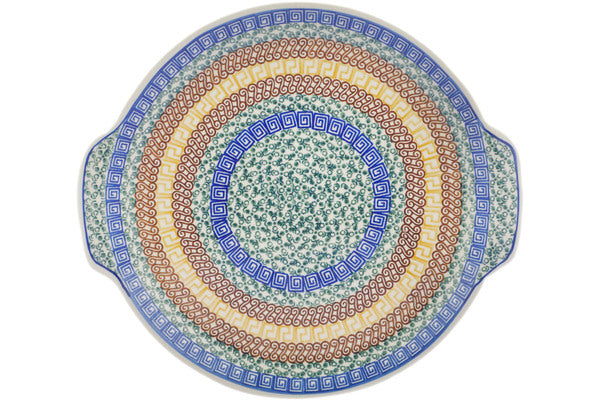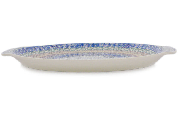 This Grecian Sea 13" Platter with Handles was handmade and hand decorated in Boleslawiec, Poland by skilled artisans according to old traditional methods. This Polish stoneware is microwave, dishwasher, freezer, and oven safe up to 480°F. It does not contain lead or cadmium. It is part of the Grecian Sea Collection.