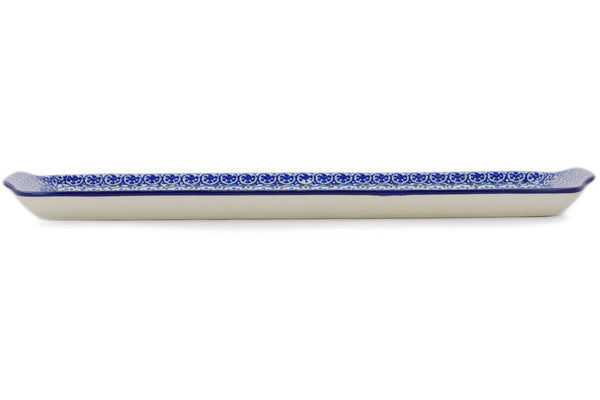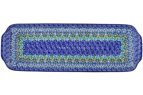 This Ocean Tulips 16" Platter with Handles was handmade and hand decorated in Boleslawiec, Poland by skilled artisans according to old traditional methods. This Polish stoneware is microwave, dishwasher, freezer, and oven safe up to 480°F. It does not contain lead or cadmium. It is part of the Ocean Tulips Collection.