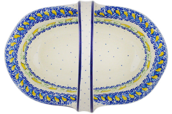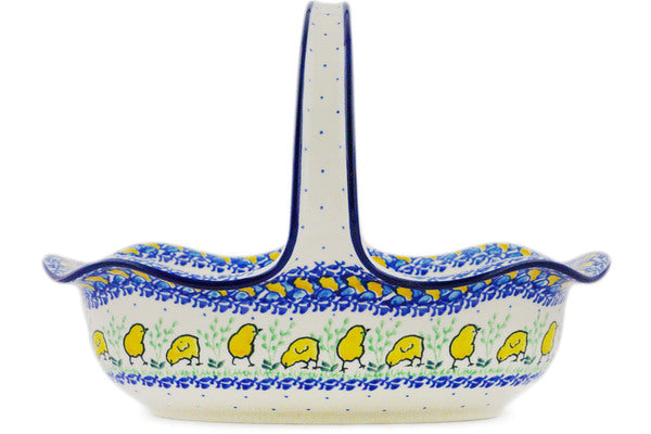 This Hatched 11" Basket with Handle was handmade and hand decorated in Boleslawiec, Poland by skilled artisans according to old traditional methods. This Polish stoneware is microwave, dishwasher, freezer, and oven safe up to 480°F. It does not contain lead or cadmium. It is part of the Hatched Collection.