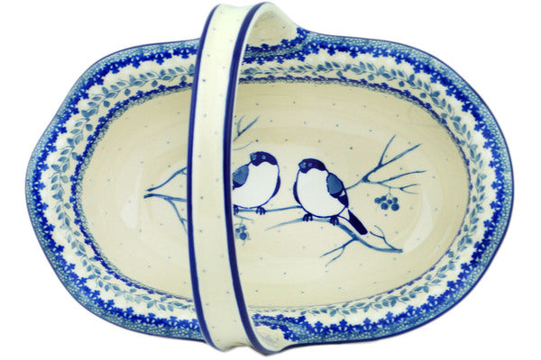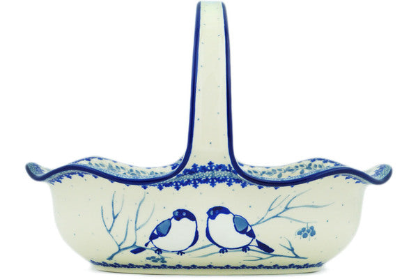 This Waiting Birds 11" Basket with Handle was handmade and hand decorated in Boleslawiec, Poland by skilled artisans according to old traditional methods. This is a Polish pottery Signature Unikat, which means that it has been hand painted with both sponges and brushes and it is signed by the artist who painted it. Unikat pieces are the most intricate works of art. Larger Unikat items take hours of very careful work to finish. This Polish stoneware is microwave, dishwasher, freezer, and oven safe up to 480°F. It does not contain lead or cadmium. It is part of the Waiting Birds Collection.