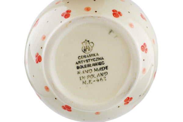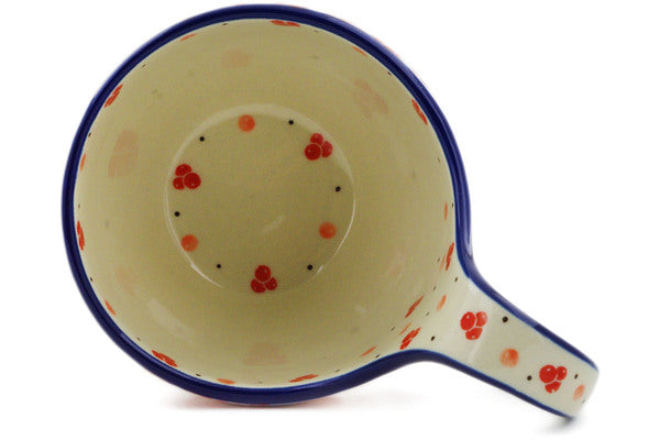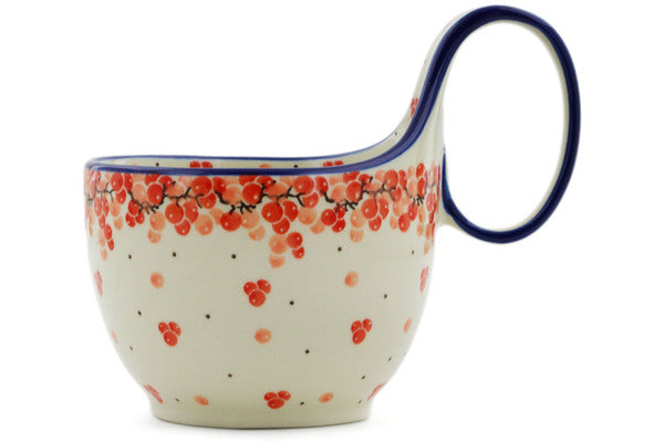 This Red Currant 16 oz Bowl with Loop-Handle was handmade and hand decorated in Boleslawiec, Poland by skilled artisans according to old traditional methods. This Polish stoneware is microwave, dishwasher, freezer, and oven safe up to 480°F. It does not contain lead or cadmium. It is part of the Red Currant Collection.