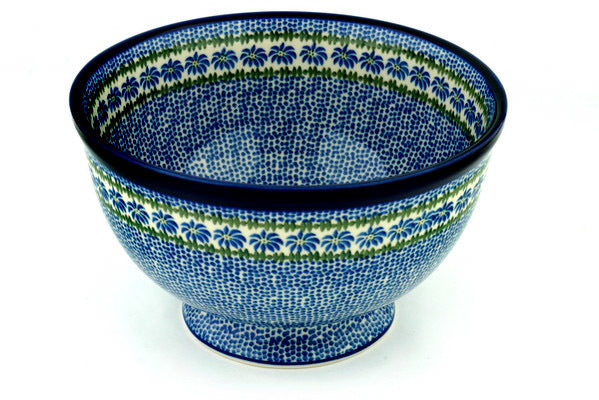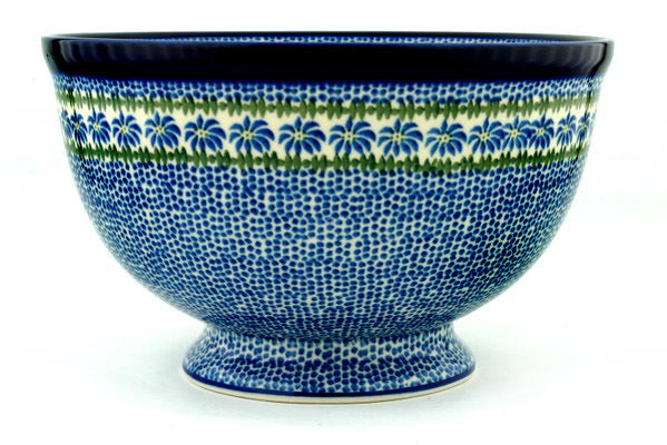 This Polka Dot Daisy 10" Bowl with Pedestal was handmade and hand decorated in Boleslawiec, Poland by skilled artisans according to old traditional methods. This Polish stoneware is microwave, dishwasher, freezer, and oven safe up to 480°F. It does not contain lead or cadmium. It is part of the Polka Dot Daisy Collection.