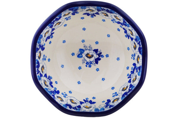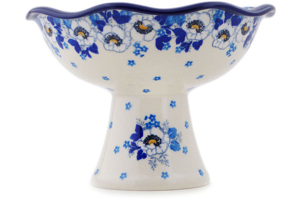 This Blue Spring 8" Bowl with Pedestal was handmade and hand decorated in Boleslawiec, Poland by skilled artisans according to old traditional methods. This Polish stoneware is microwave, dishwasher, freezer, and oven safe up to 480°F. It does not contain lead or cadmium. It is part of the Blue Spring Collection.