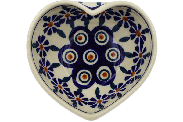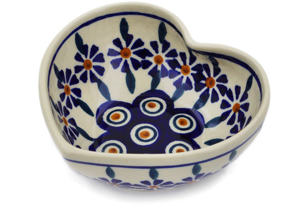This Peacock 4" Heart Shaped Bowl was handmade and hand decorated in Boleslawiec, Poland by skilled artisans according to old traditional methods. This Polish stoneware is microwave, dishwasher, freezer, and oven safe up to 480°F. It does not contain lead or cadmium. It is part of the Peacock Collection.
