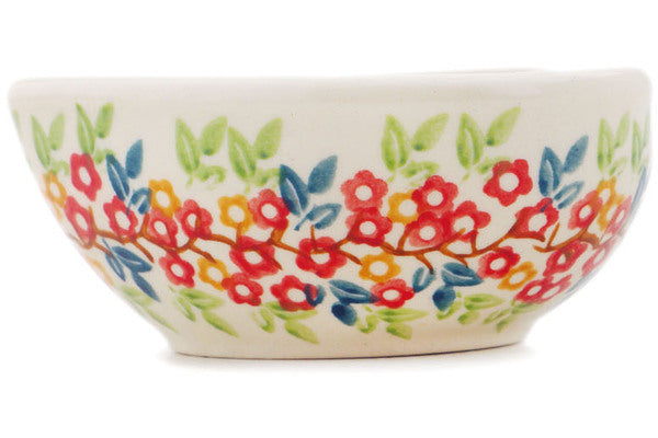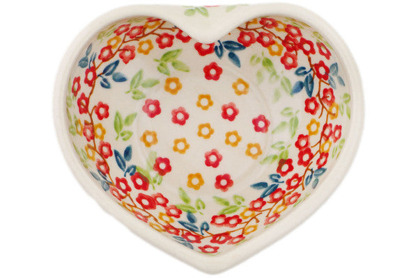 This Tropical Bloomscape 4" Heart Shaped Bowl was handmade and hand decorated in Boleslawiec, Poland by skilled artisans according to old traditional methods. This Polish stoneware is microwave, dishwasher, freezer, and oven safe up to 480°F. It does not contain lead or cadmium. It is part of the Tropical Bloomscape Collection.