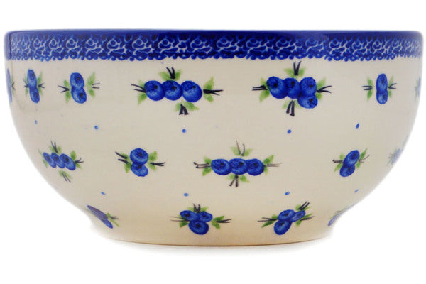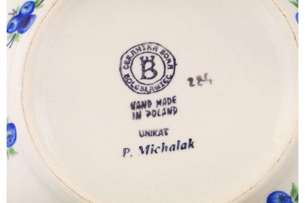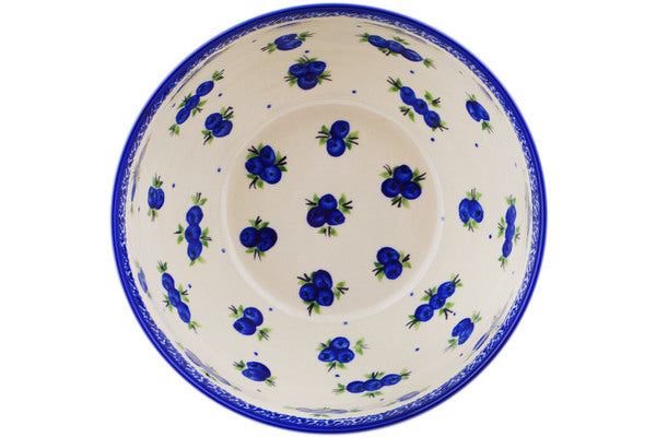 This Blueberry Dreams 9" Mixing bowl, serving bowl was handmade and hand decorated in Boleslawiec, Poland by skilled artisans according to old traditional methods. This Polish stoneware is microwave, dishwasher, freezer, and oven safe up to 480°F. It does not contain lead or cadmium. It is part of the Blueberry Dreams Collection.