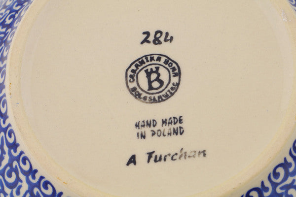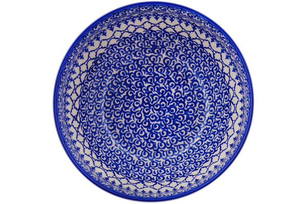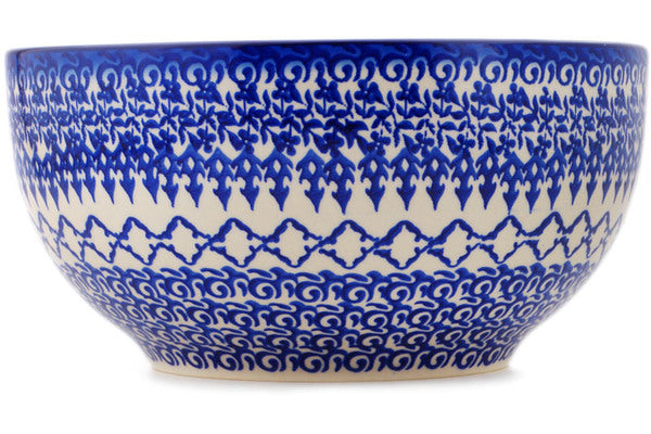 This Winter Blue 9" Mixing bowl, serving bowl was handmade and hand decorated in Boleslawiec, Poland by skilled artisans according to old traditional methods. This Polish stoneware is microwave, dishwasher, freezer, and oven safe up to 480°F. It does not contain lead or cadmium. It is part of the Winter Blue Collection.